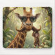A vibrant jungle where a whimsical giraffe sports a large moustache, playfully adorned with a dangling monkey, all under the warm glow of sunlight
