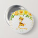 This cute and whimsical button can be personalised with a name or title, such as mum, grandma, niece, big sister etc. The design features an adorable giraffe with a flower crown and yellow floral arrangements with faux gold glitter confetti. The text combines handwritten script and sans serif fonts for a stylish and modern look. This is perfect for a giraffe themed baby shower.