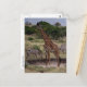 Classic African scene of giraffe and zebra surrounding a shallow waterhole in the Masai Mara, Kenya. Fully customisable postcard.
