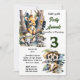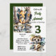 A fun and trendy 3D ai generated graphic featuring a cute and adorable baby zebra wearing a zebra striped colonial safari hat ; a baby elephant with big ears wearing a floppy hat with flowers on it; a giraffe resting with its front legs hanging over the branch of a tree and an adorable meerkat smiling sweetly wearing a colonial hat. They are set against a white background that has custom text templates on it; a large forest green template for the birthday girls age and leaf greenery. The back is the same dark green colour. These are ideal for any jungle, safari, wild animal or wildlife summer fun birthday party theme for kids. Instant downloads include both the front and back of the invitation.