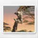 An adult giraffe greets a baby giraffe against the backdrop of an African sunset.