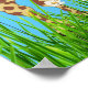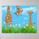 Cute giraffes in green grass and daisies on blue sky with white clouds.
