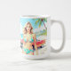 Portrait of a charming girl on a beautiful tropical beach with sun and sea, and a classic flaming red car, which frames the bright panorama with vibrant, bright summer colours.