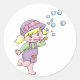 An old time design featuring a little girl wearing a lilac hat and overall shorts blowing soap bubbles from a bubble pipe.