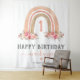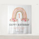 Rustic bohemian girl 1st birthday tapestry featuring a simple white background, a cute watercolor boho rainbow, elegant pink florals, and a modern "happy birthday" template that is easy to customise.
