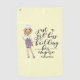 This golf towel features an elegant woman with the text "Just a girl boss building her empire". This can be personalised with your name in elegant calligraphy. It has a yellow background.