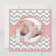 Chic grey and white chevron print with coral pink accents and 3D-look polka dot bow and ribbon baby girl birth announcement photo card.
