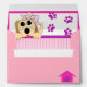 Sweet little girl dog with a bow, hanging over your customisable striped invitation. Pink and purple dog house too.