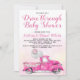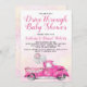 Drive through baby shower invitation with cute pink truck, balloons and banner on a pink and gold watercolor background. This drive through baby shower invitation is easily customised for your event by simply adding your event details.