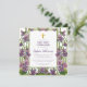 The text is inside a floral frame of purple violets (with green rectangular borders)There is a (faux) gold cross above the text. The text is purple, like the violets. The name is written in a handwriting script, the rest in caps. The back is uniformly purple like the violets.