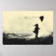 Girl Flying Kite on the Shore at Dusk – Charcoal Poster