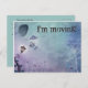 This postcard is an announcement of a new home, apartment, condo etc. It features a girl flying with an umbrella, a melting clock and a twisted lamp post. A tree is to the right and flowers are at the bottom. The text on the front says "I'm moving". The text on the front and back is editable so go ahead and change what it says. Change the font size, placement and colours too and make it your own!
