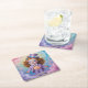 This coaster contains an acrylic canvas painting of a charming clown girl with curly ginger hair and a cute expression. She is adorned with pastel clown makeup, wearing a medium purple top hat with a blue ribbon, a peach button-up shirt, a lavender blazer, a lavender and pink polka dot tie, lavender pants, and lavender shoes accented by colourful balloons. The background is a dreamy blend of pastel pink, blue, lavender, yellow and peach. That is a misty cloudy background that adds a whimsical touch. Diffused lighting enhances the ethereal quality of the painting, highlighting the details of her costume and expression. The coaster is a square paper pulp coaster in a coaster set with six coasters.