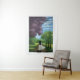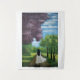 Girl in White Dress A girl in a white dress walking down a path lined with green and purple trees