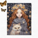 This cute illustration depicts a little girl cuddling a red fox. They are surrounded by flowers reminiscent of folk art, and the child herself has a floral crown, giving this lovely card a magical, fairytale feel.