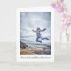 A greetings card featuring a woman jumping for joy off some rocks on a beach. Her arms and legs are partially outstretched, turning it into a crab jump. She's wearing a padded jacket against the cold and her hair is lifting in the wind. With a happy expression and eyes wide, the overall impression is of wild exuberance.