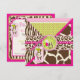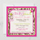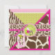 Wild and fun monkey hanging on jungle vine and a wild pacifier with zebra, giraffe, leopard, and cheetah patchwork prints with 3D-look lace trim ribbons baby shower invitation. Colours are hot pinks, greens, and browns.