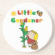 A little blonde girl looks up to see the top of the corn stalk growing in her garden on this cute and colourful gardening design on bibs, burp cloths, blankets, keepsakes, plates, pillows, and many other items.