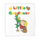 A little blonde girl looks up to see the top of the corn stalk growing in her garden on this cute and colourful gardening design on bibs, burp cloths, blankets, keepsakes, plates, pillows, and many other items.
