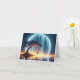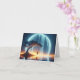 A serene landscape features a silhouetted girl on a swing under a tree set against a luminous cascading waterfall that resembles a radiant moon for a blank note card.
