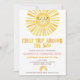Cute girl's first trip around the sun themed first birthday invitation featuring a large sun with a smiling face, small rainbow and some multicolored text. This girl's first trip around the sun 1st birthday invitation is ideal for someone looking for a simple modern invitation design.