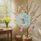 Girl Photo with funny Easter Bunny Ears and painted eggs on blue background on your own Easter ceramic ornament. May be a keepsake for yourself, or a personalized gift for a friend or family member. Generative content images may be changed. Humor Greeting saying "Some Bunny Loves You" on the front of the ornament, and on the back, the greeting text. If you replace the girl photo with your own, please use the option "remove background" from edit menu.