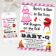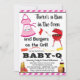 Girl barbecue baby shower invitation with cute apron and bbq on a pink gingham background. This baby bbq baby shower invitation is easily personalised for your event by simply adding your event details.