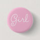 Let guests show their pick with this sweet gender reveal party button featuring the word "Girl" in elegant white calligraphy script on a soft pink background. The feminine script style adds a chic, stylish touch to gender reveal celebrations and baby showers. All text is fully customizable.