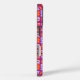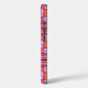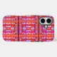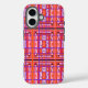This art by me, Kristie Hubler, on this iPhone case, is an abstract, feminine type of folk art, with wiggles, swirls, curves, spirals, dots, and flowers inside a plaid layout, in pinks, salmon, orange, gold, deep periwinkle iris, aubergine or dark reddish brown
