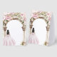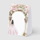 A pink floral garden arch with a girl in a pink dress.