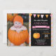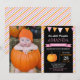 Girl Pumpkin Birthday Invitation with custom photo. Little Pumpkin Fall Birthday Invite. 1st First Birthday. Orange and pink stripes, chalkboard background. For further customisation, please click the "Customise it" button and use our design tool to modify this template.