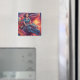 This magnet has an artsy picture of a girl riding a dragon on it.
