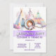 An adorable, cute and girly watercolor ai graphic featuring three 3D fantasy inspired teepee tents in pastel shades of pink, blue, orange and white that have sparkling little fairy lights on them and the cutest little girl fast asleep on a round cushion in front of them. The illustration is set against a white background that has purple editable text templates on it for your custom wording. These are ideal for your daughter if she is having a sleepover; slumber; movie night or girly pajama party theme party for friends to celebrate her birthday.
