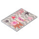 A white bunny rabbit superhero in a pink mask and dress with a heart, a brown cape, and striped socks on a background of grey and white chevron stripes, pink, deep wine, and red stars, and blue and red trees on products for the home, office, and personal use. This cute Girl Superhero Bunny design is great for kids and adults who love fun, colourful, whimsical designs!