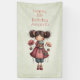 Birthday banner with a cute retro image featuring a whimsical girl with rosy cheeks and flowers in her hair. Carrying a green frog doll.