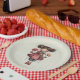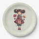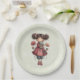 Paper plates with a cute retro image featuring a whimsical girl with rosy cheeks and flowers in her hair. Carrying a green frog doll.