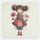 Stickers with a cute retro image featuring a whimsical girl with rosy cheeks and flowers in her hair. Carrying a green frog doll.