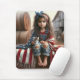 Cute little girl sitting on a hay bale with an American flag and kitten