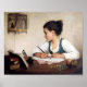 Vintage image of a young girl at a writing table with her bird out of its cage, sitting on the table top.