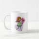 Cute mini art of a whimsical girl with long flowing yellow hair and wearing a green dress and striped stockings. She is holding a beautiful bunch of red roses in her outstretched hands. Originally made as digital art, An adorable piece of artwork to bring a smile with your morning coffee.