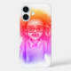Girl with glasses, iPhone case, A colourful phone case featuring an artistic sketch of a young girl with large glasses and curly hair. She is adjusting her glasses with one hand and has a gentle smile. The drawing is shaded with a gradient of warm red, orange, pink, and purple hues, giving it a vibrant and playful feel.