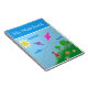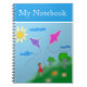 Girl with Kites Flowers Sun Drawing notebook. A girl holding kites that are flying in the sky. The drawing with flowers and the trees on a green hill, where the girl in a red dress is standing.