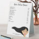Personalizable price list template for hair salons, hairdressers and hair stylists featuring Destei's cartoon illustration of a beautiful woman who has long black hair flowing in the wind. The woman's eyes are closed and her lips are pink. Personalise the text areas with the details of your business.