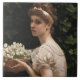 This design features a painting by the English artist Sir Edward John Poynter (1836–1919), who served as President of the Royal Academy of Arts. It depicts a beautiful young woman wearing an elegant white dress. She is standing in a garden with a basket of pea blossom flowers that she has collected. The flowers are bright white and match the girl's dress. The original artwork was painted by Edward Poynter in 1890.