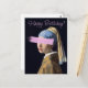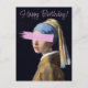 Pop art vintage remix of Girl with pearl earing with a pink brush stroke. Happy birthday greeting.