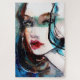 Original portrait artwork - colourful watercolor and ink painting of beautiful fashion style girl with red lips on a blue background. Beautiful, stylish gift for a beauty and fashion lover!