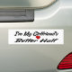 Bumper sticker with I'm my girlfriend's better half in 3D black text.