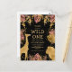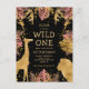 This "wild one" jungle safari themed girl's first birthday party invitation postcard features gold faux foil animals (giraffe, lion and monkeys), gold and pink jungle foliage, and a sprinkling of gold confetti on a black background. Add the name of the birthday girl and party details in gold text and your return address in black on the reverse.