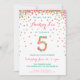 Celebrate your 5 year old's birthday with colourful gold, pink, mint and teal confetti on these 5th birthday invitations! Featuring your daughter's party details and a "5" in confetti. Title reads "Oh Me, Oh My!" Cute colourful matching stripes on the back.
