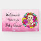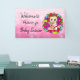 Adorable hand drawn little cartoon Caucasian baby girl surrounded by pretty brightly coloured whimsical flowers personalised baby shower banner. Pink, purple, teal and red.